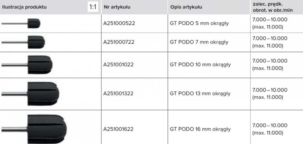 - 13 milimetrów – zalecane obroty do 10 000/ minutę – ten rozmiar nie powinien być używany przy frezarkach podologicznych z pochłaniaczem pyłu!