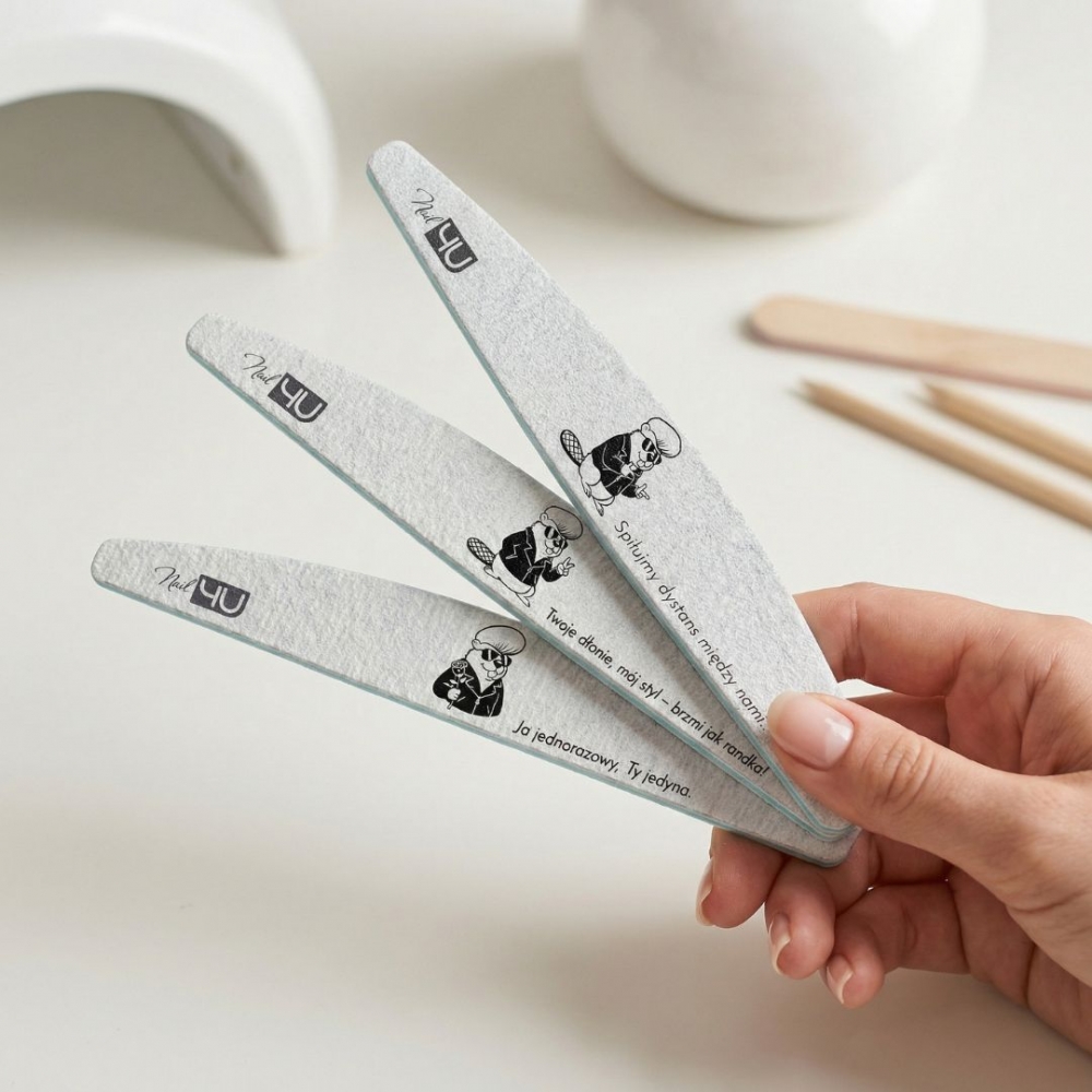 Przy zakupie 100 sztuk tych samych pilników (kształt, gradacja). Nail4U zamienia 1 lub więcej pakietów (po 25 szt.) na pakiety z limitowanej serii BÓBR (pilniki z nadrukiem bobra i hasłami).